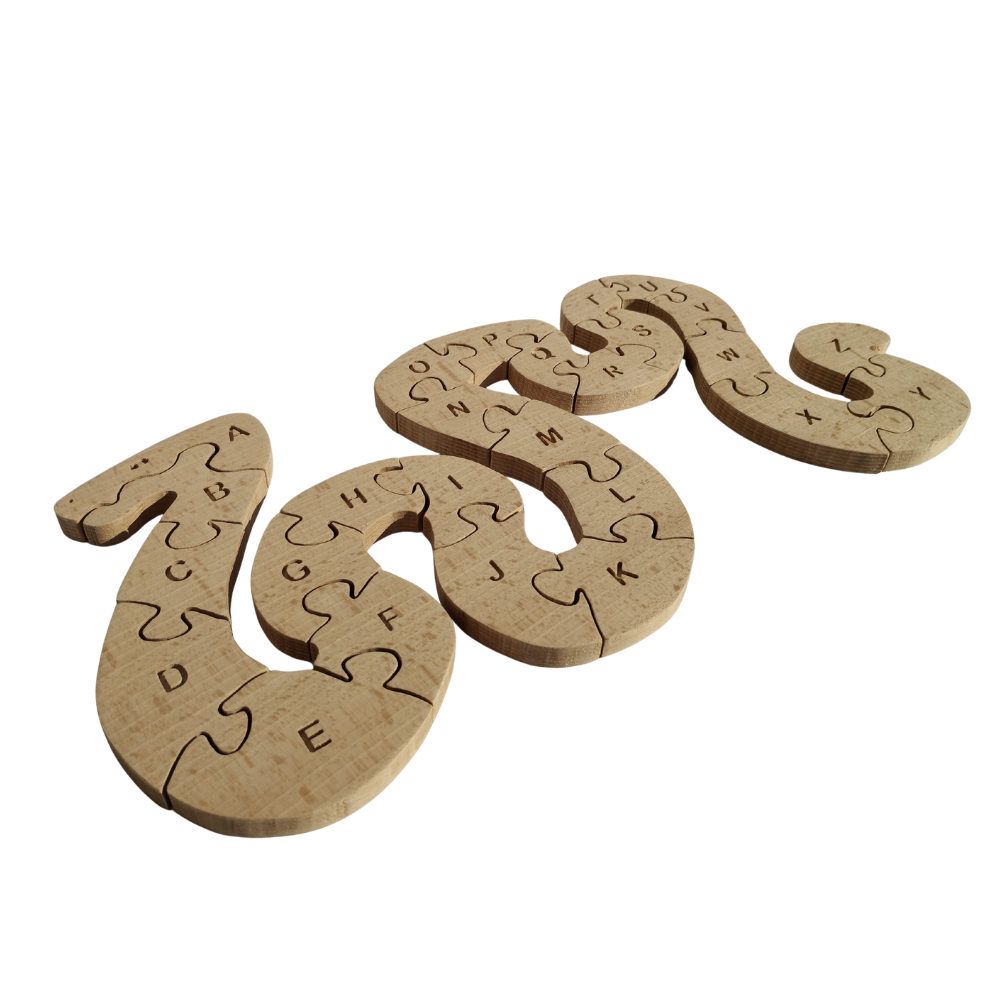 Puzzle serpent de l’alphabet : 26 pièces de puzzles en forme de serpent pour apprendre l’alphabet de façon ludique Essence de bois : Hêtre Dimensions : Hauteur de 20 cm Longueur de 40 cm Épaisseur de l’essence de bois de 15mm